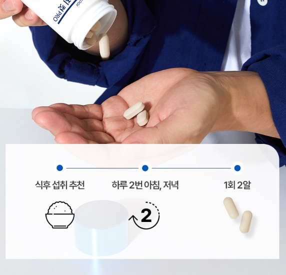 - 권장 섭취량 준수: 하루 2회, 식사와 함께 한 알씩 섭취합니다. 아침과 저녁 식사 후에 섭취하는 것이 좋습니다.