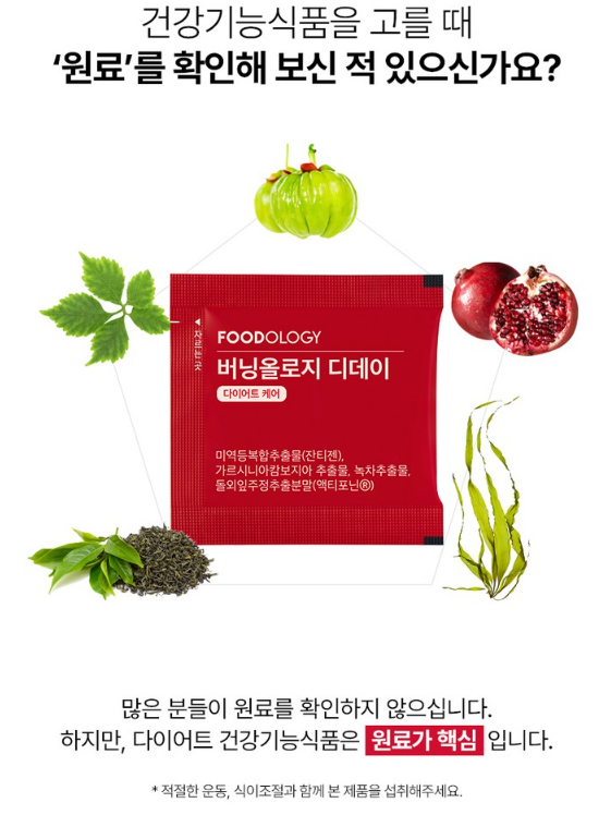 푸드올로지 버닝올로지 디데이 단기 다이어트 보조제는 천연 성분을 사용하여 부작용을 최소화했습니다. 인공 첨가물 없이도 효과를 볼 수 있어 건강한 체중 감량을 지원합니다.