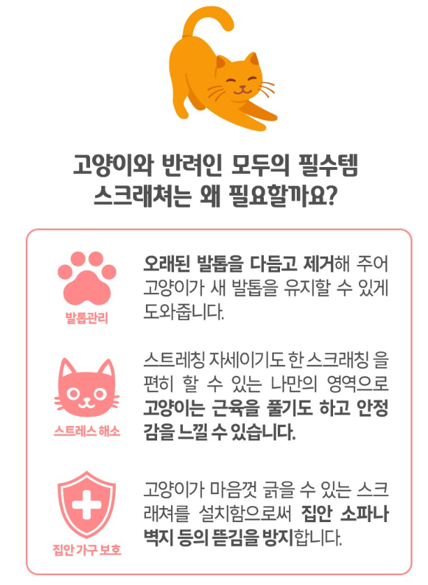 적절한 스크래칭은 고양이의 발톱 건강을 유지하고, 스트레스 해소에 도움을 줍니다. 코멧 펫 스크래쳐는 고양이의 자연스러운 행동을 촉진하여 전반적인 웰빙을 증진시킵니다.