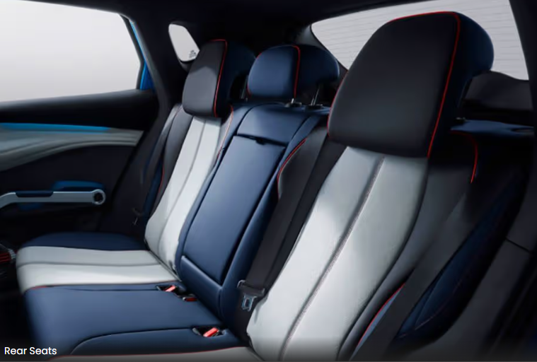 - 시트는 지속 가능한 비건 가죽으로 제작되었으며, 다채로운 색상과 레드 스티치가 돋보입니다