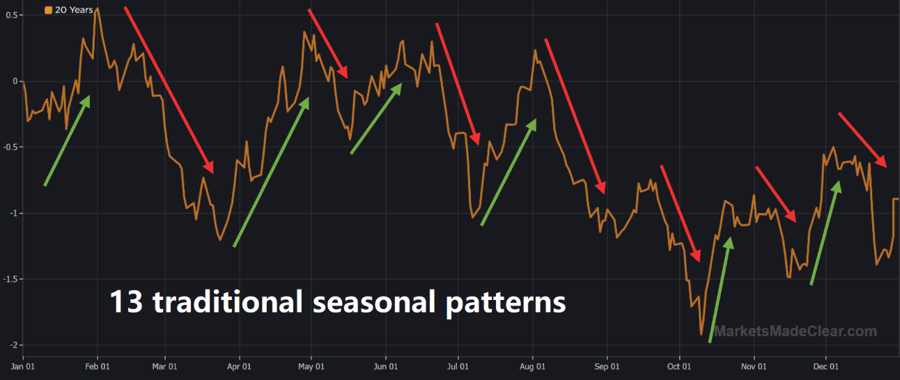 Seasonal Patterns – 주식에서 강세와 약세 달 (20-year averages)