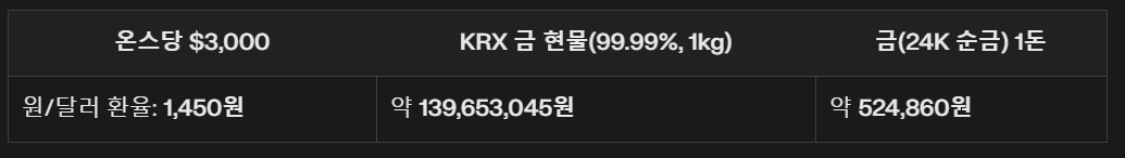 - KRX 금 현물(99.99%, 1kg): 현재 국제 금값과 원/달러 환율(약 1,450원)을 기준으로 계산하면, KRX 금 현물 1kg 가격은 약 135,000,000원에 해당합니다.