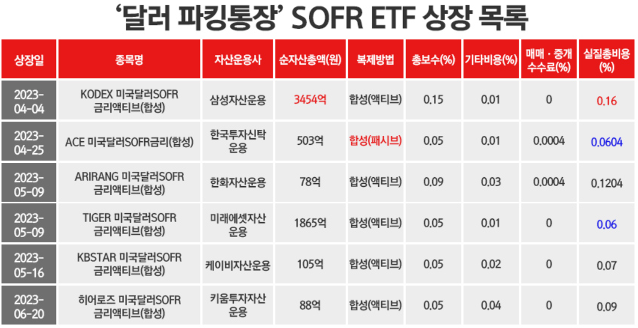 현재 국내에는 여러 자산운용사에서 출시한 SOFR ETF가 있습니다. 이들은 모두 2023년 4~6월 사이에 상장되었으며, 기본적인 투자 전략은 유사하나 수수료와 규모에 차이가 있습니다.