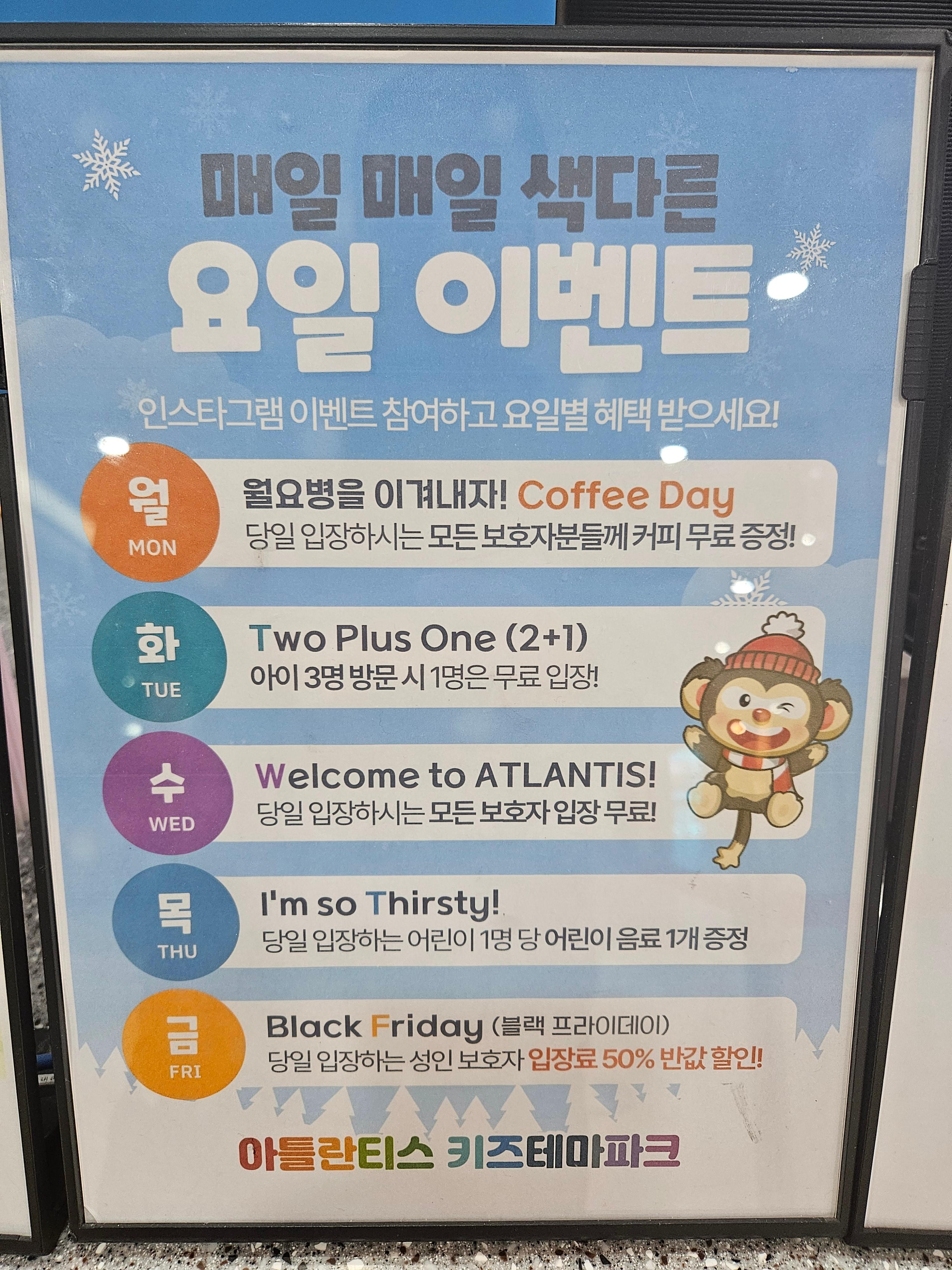 저희는 수요일 아이와 함께 갔는데 종일권 구매 후 어른들은 무료로 입장했어요. 요일 이벤트를 받으시려면 꼭 인스타그램 이벤트에 참여하시고 프론트에서 요일이벤트 참여하고 싶다고 꼭꼭꼭 말씀드리세요.