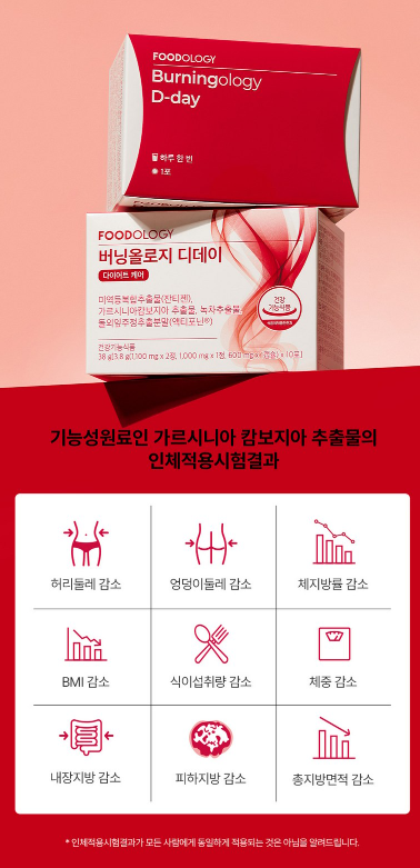 푸드올로지 버닝올로지 디데이 단기 다이어트 보조제는 체중 감량을 목표로 하는 분들에게 최적화된 성분 조합을 자랑합니다. 신진대사를 촉진하고 지방 연소를 도와 단기간 내에 효과적인 체중 감량을 도와줍니다.