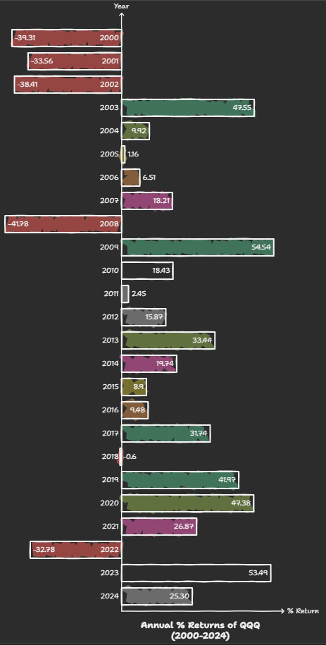 이번 글에서 QQQ의 1년, 3년, 5년, 10년, 20년, 그리고 25년 동안 투자했을때 성과를 살펴보고, 가장 큰 상승 및 하락 연도에 대해 알아보겠습니다.
